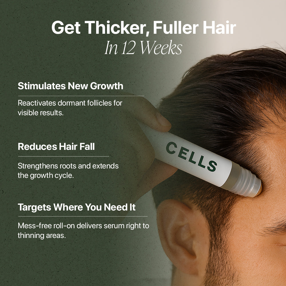 The Cells™ Hair Growth Serum is a targeted DHT-blocking scalp serum designed to revive thinning hair, strengthen roots, and improve scalp health in one easy step.